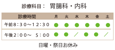 胃腸科を主に内科全般を診ています。患者さんのお話によく耳を傾け、懇切丁寧な診療を心がけております。検査は、苦痛の少ない経鼻内視鏡、経口内視鏡、大腸内視鏡、消化管透視検査、超音波検査等を行っております。お気軽にご相談ください。